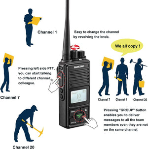 - 【Water-resistant Big Keypad with LCD Screen】Perfect for adults and beginners. Rotate the Power knob to turn on the 2 way radio, adjust the volume, and select the channel. Keep all members in know with a unique GROUP function. It enables you to deliver messages to all the team members even they are not on the same channel
